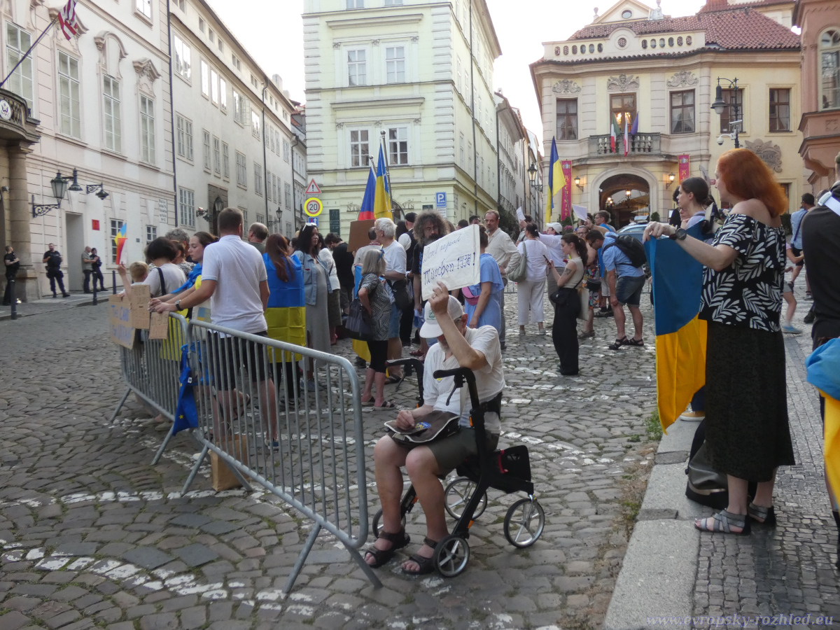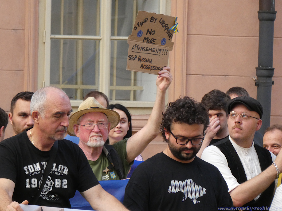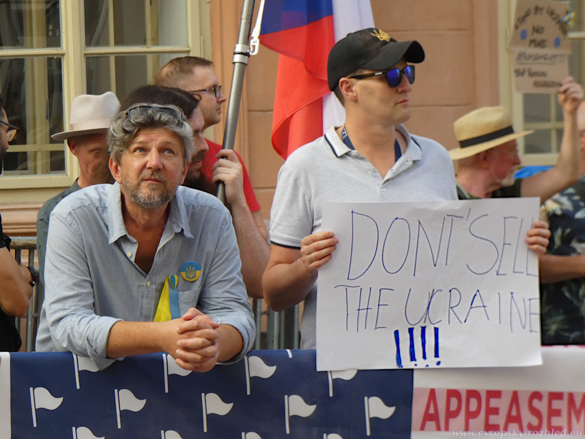 Protestu se zúčastnila zhruba stovka lidí, převážně z dlouhodobě aktivních proukrajinských skupin a iniciativ. Mezi přítomnými byli například Otakar van Gemund, Julie Levková či Anastasia Sihnaievska. Atmosféra byla klidná, bez proslovů a skandování – účastníci pouze stáli s českými a anglickými bannery. Mezi nejvýraznější patřily transparenty s nápisy „SMRDÍTE ZRADOU / YOU REEK OF BETRAYAL“, „NO NOBEL PRIZE FOR APPEASING EVIL #Alaska2025“ či „DON’T SELL OUT Ukraine“. Na chodníku před demonstranty ležel velký banner stylizovaný jako americká vlajka s opakovanými slovy „BETRAYAL“, „APPEASEMENT“, „HYPOCRISY“ a dalšími. Mezi transparenty vyčnívala historická fotografie z Mnichova 1938.