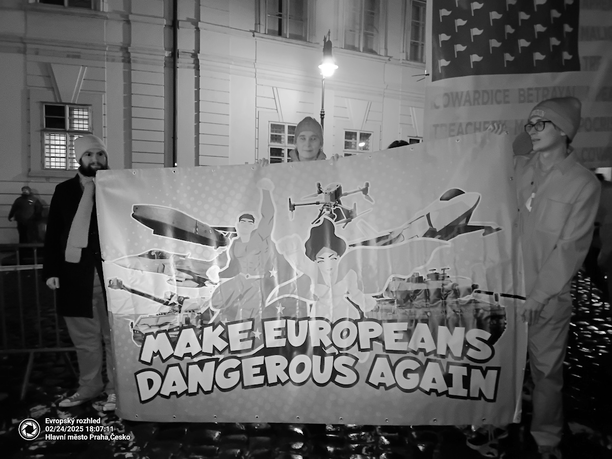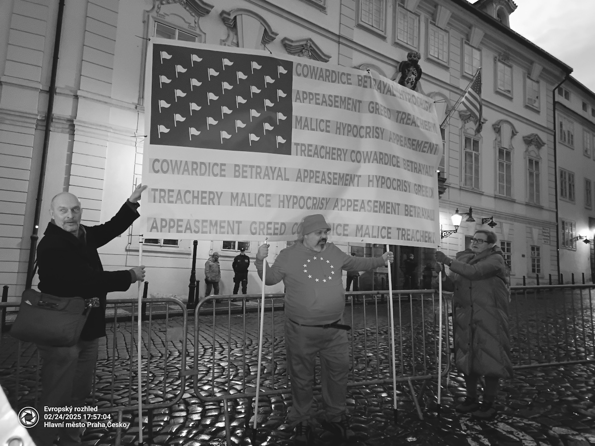 Vizuální happening byl organizován několika skupinami, jmenovitě iniciativami Kaputin, Pulse of Europe, Občanský rozcestník a Volt ČR. Na třetí výročí plnohodnotné ruské invaze na Ukrajinu se účastníci sešli u americké ambasády s bannery a grafikou reflektující tuto situaci s jasným poselstvím: Evropa se již nemůže spoléhat na USA při obraně Ukrajiny a celého kontinentu.