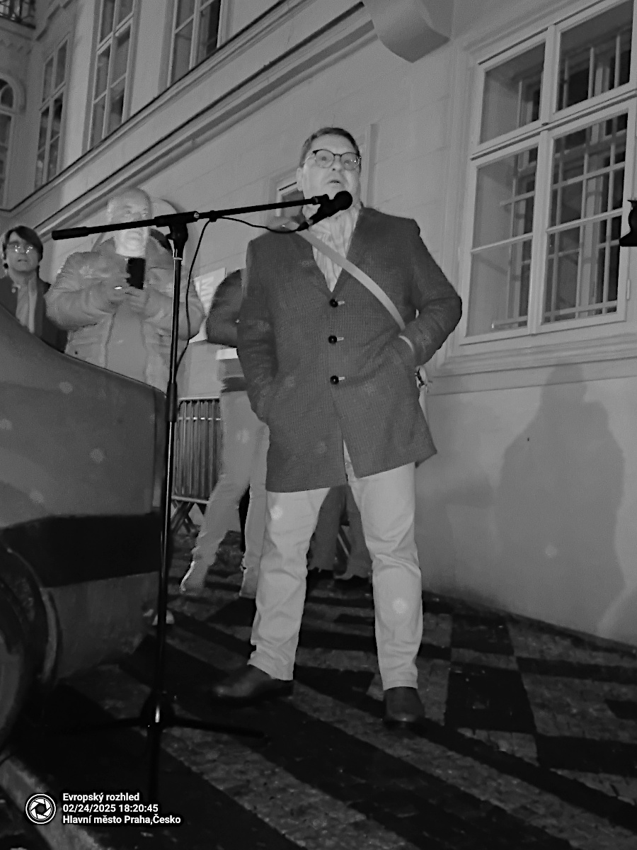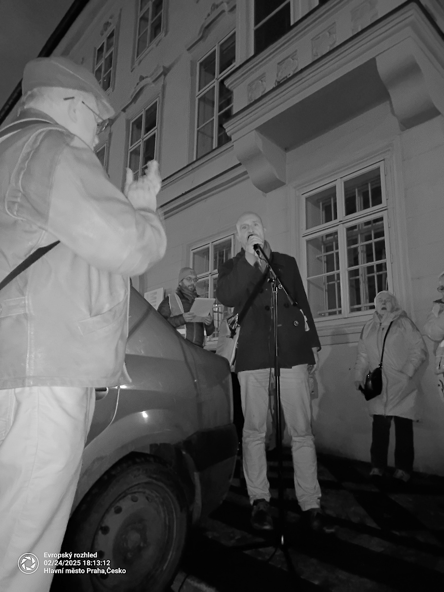 Petr Hlaváček, historik a filozof, přednesl velmi intenzivní a provokativní projev, v kterém zároveň poukázal na širší geopolitickou situaci a hlubší historické souvislosti konfliktu.
