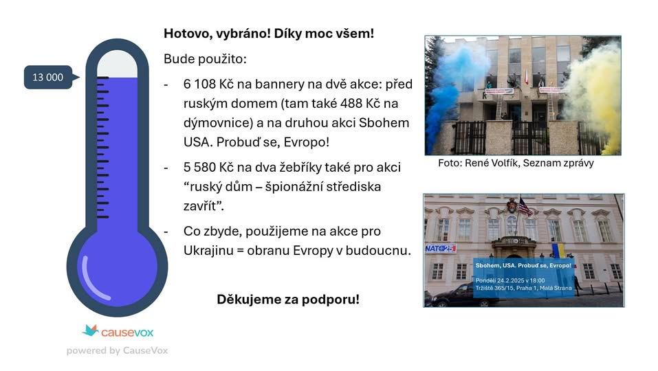 Aktivisté z vybraných peněz pořídili dva žebříky, po kterých vyšplhali na budovu Ruského domu v pražském Bubenči. Na fasádě vyvěsili českou vlajku a dva bannery s nápisem „Russácké majetky zabavit, špionážní střediska zavřít!“ Před plotem odpálili dvě dýmovnice v modré a žluté barvě, které jasně vyjadřovaly podporu Ukrajině. Použití žebříků k vyvěšení bannerů naznačuje, že cílem bylo udělat na třetí výročí ruské invaze něco viditelného a odvážného – akce měla také mnohem větší mediální zásah než ta večerní.